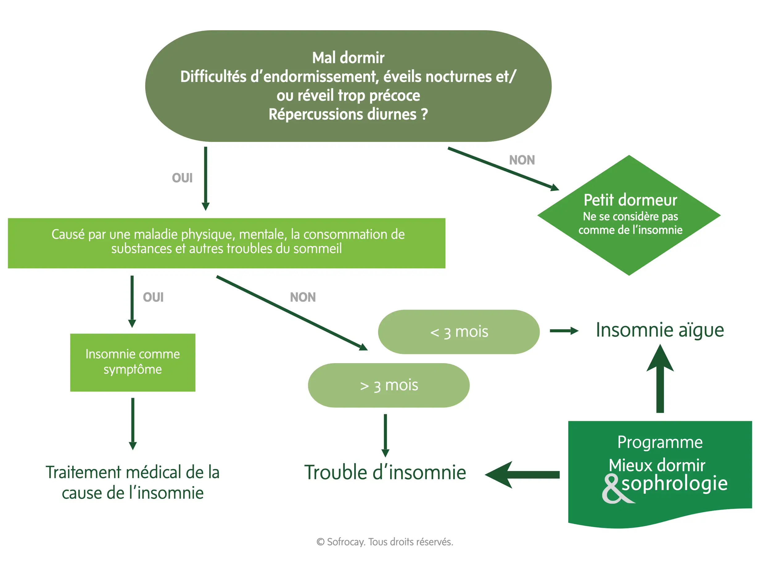 Il est important d’exclure une éventuelle maladie physique, mentale, la consommation de médicaments et/ou de substances ou un trouble associé au sommeil, qui pourrait interférer avec la qualité ou la quantité de sommeil.